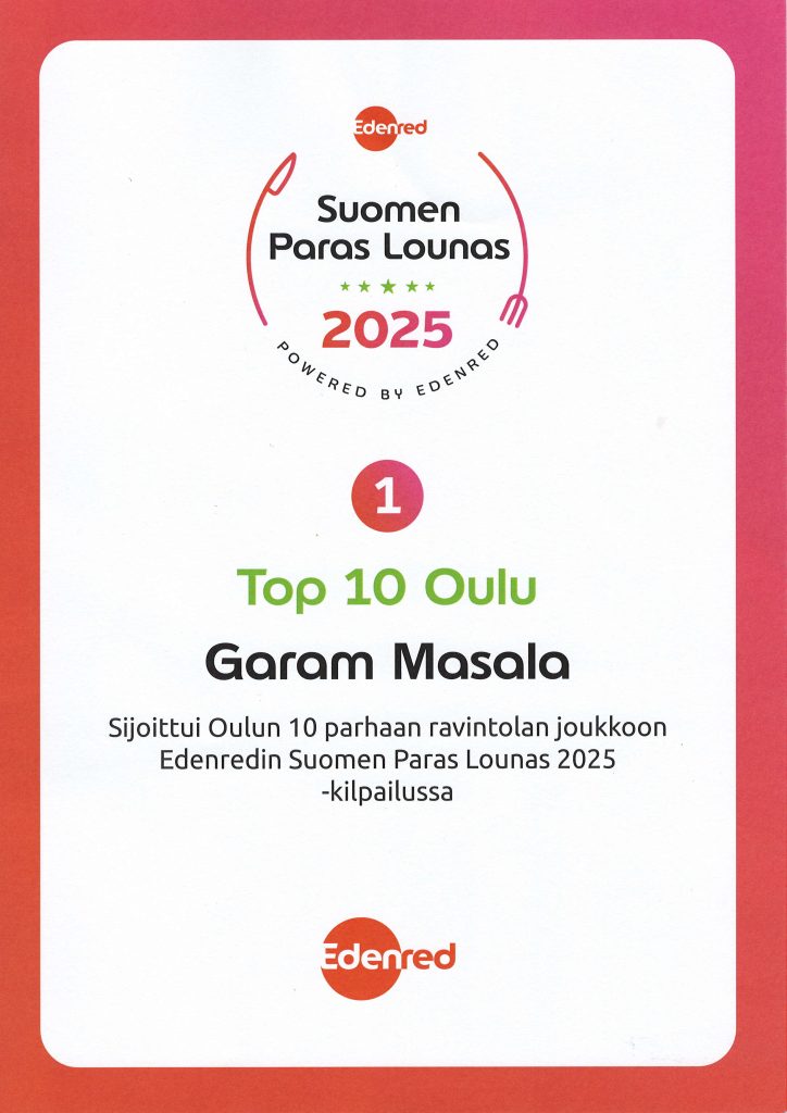 Garam Masala haluaa kiittää lämpimästi kaikkia niitä lukuisia asiakkaita, jotka äänestivät ja mahdollistivat ravintolalle Oulun parhaan lounaan ravintolan tittelin vuonna 2025. Ravintola on myös valtakunnallisesti sijalla 16, mistä olemme erittäin ylpeitä tuntien kilpailijoidemme laadun. Teemme aina parhaamme asiakkaidemme tyytyväisyyden eteen ja toivomme, että pystymme säilyttämään vanhat asiakkaat ja valloittamaan uusien asiakkaiden sydämet myös ensi vuonna.